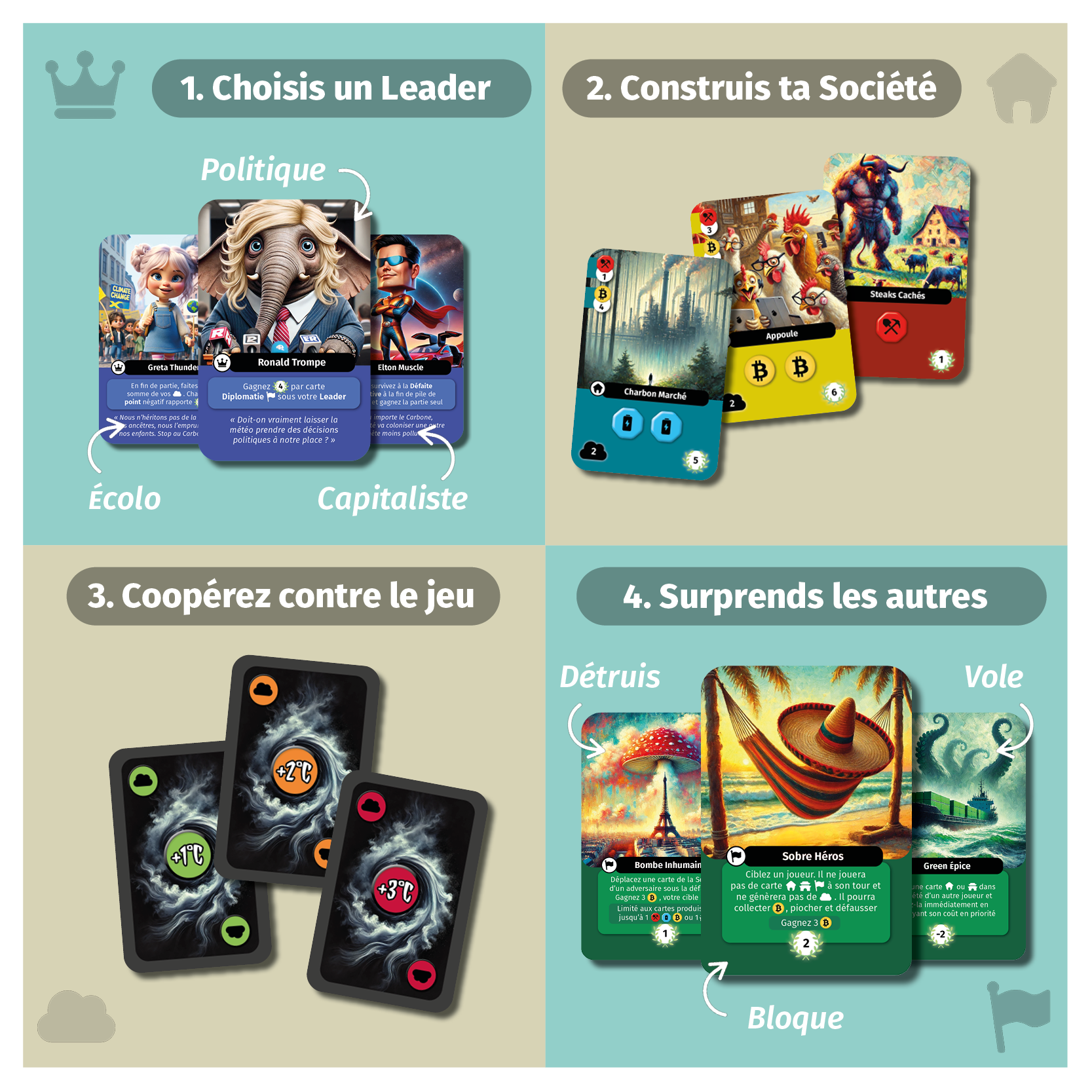 Dans Carbone, vous incarnez des Leaders prêts à tout pour faire rayonner leur Nation. Plus vous vous développez, plus vous produisez du Carbone… et contribuez au réchauffement global. Si les émissions dépassent un certain seuil, la partie s’arrête pour tout le monde.